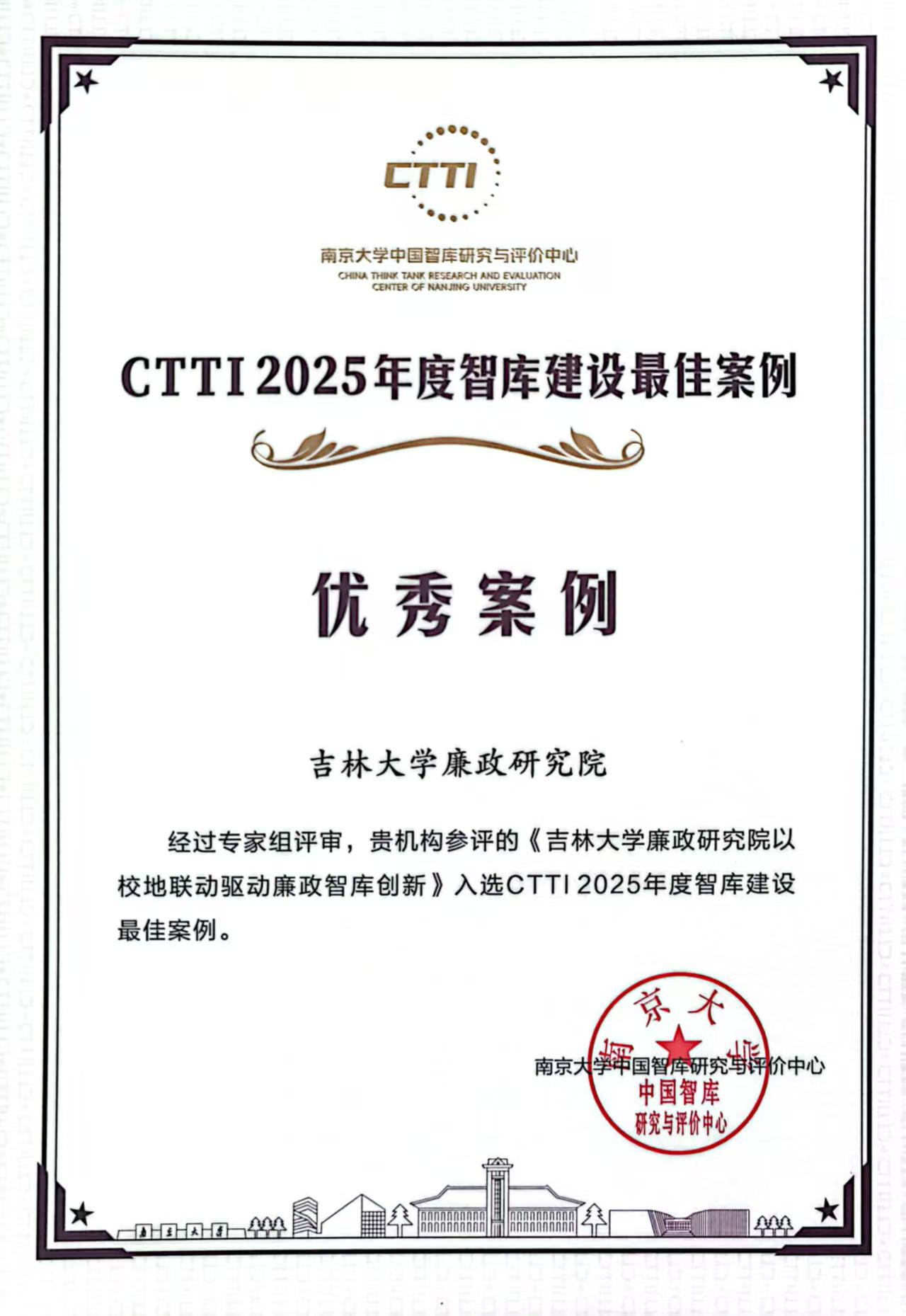 近日,南京大学中国智库研究与评价中心发布CTTI2025年度智库建设最佳案例评选结果,吉林大学廉政研究院申报的《吉林大学廉政研究院以校地联动驱动廉政智库创新》案例成功入选。这是研究院继入选“中国智库综合评价研究项目(2025)”AMI智库及中国智库参考案例后,在国家级智库评价体系中斩获的又一重要成果,标志着智库建设模式创新与实践成效获权威高度肯定。