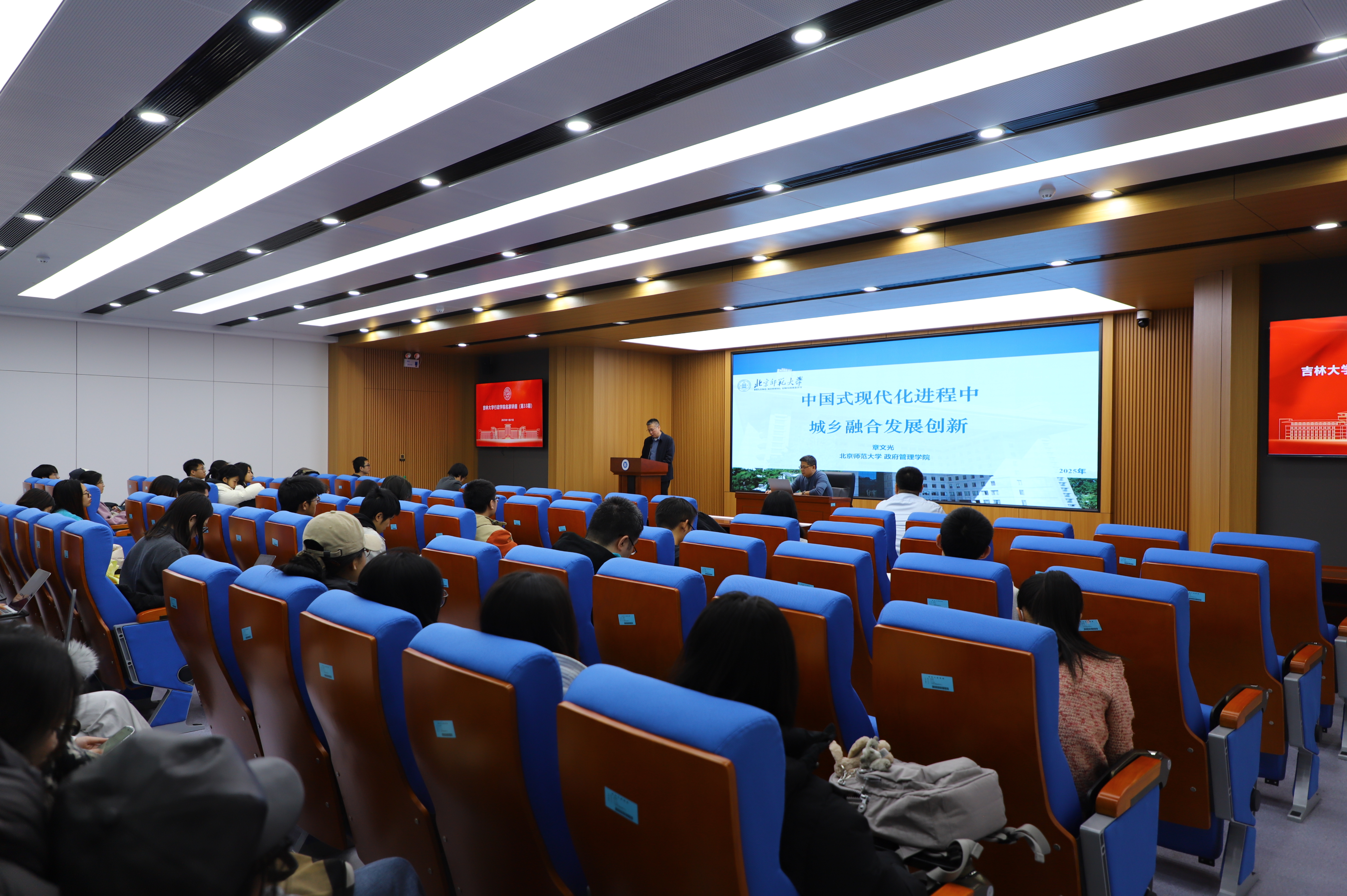 2025年11月21日下午,吉林大学行政学院名家讲座(第33期)在东荣大厦B102报告厅举行,北京师范大学二级教授、政府管理学院院长、国家哲学社会科学领军人才章文光受邀担任主讲嘉宾,作题为“中国式现代化进程中城乡融合发展创新”的学术演讲。学院公共管理系董伟玮教授,李慧杰副教授,常成副教授,讲师施响及院内外60余名同学参与讲座。讲座由学院副院长刘雪华教授主持。