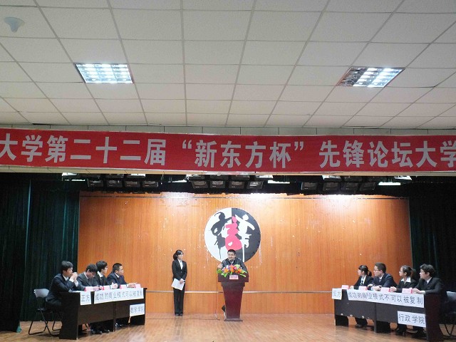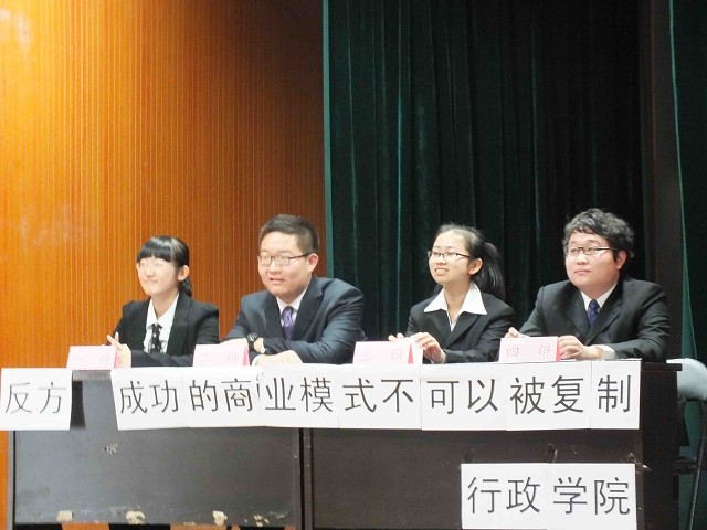 11月17日13时许,吉林大学第二十二届“新东方杯”先锋论坛大学生辩论赛第二轮比赛在中心校区田家炳学生活动中心A座礼堂拉开帷幕。来自行政学院和数学学院的辩论队伍就“成功的商业模式是否可以被复制”的辩题展开了激烈而又精彩的辩论。反方是由一辩范子雁、二辩寻累硕、三辩贾茹、四辩张冰组成的行政学院代表队,他们秉持的观点是“成功的商业模式不可以被复制”,正方数学学院代表队的观点是“成功的商业模式可以被复制”。