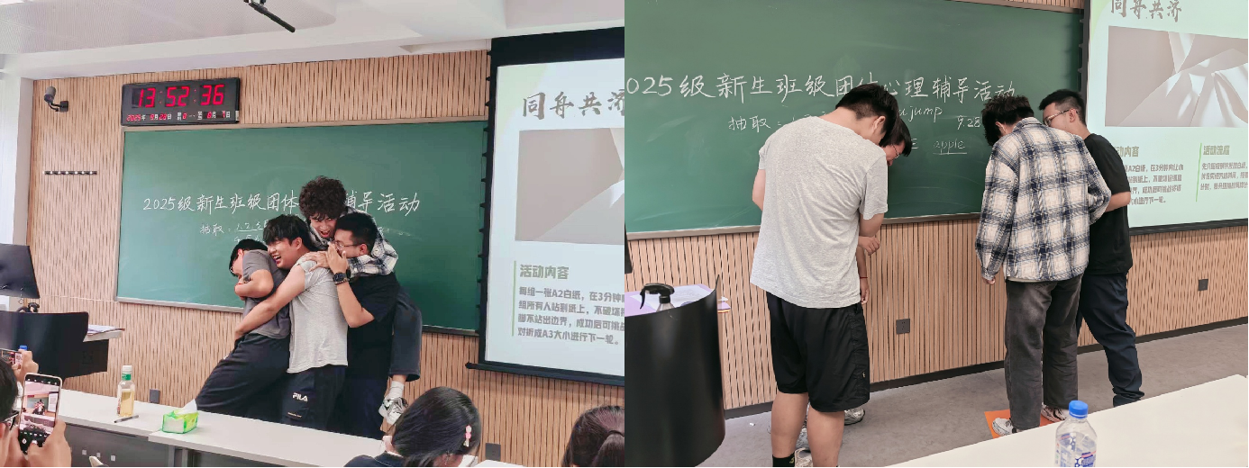 团体心理辅导活动以“我们是相亲相爱的一家人”为主题,通过一系列轻松有趣的互动游戏,让新生在欢笑声中拉近距离,感受集体的温暖与力量。活动在“一分钟鼓掌”的热身环节中拉开序幕,同学们在掌声中遇见新的自己。随后通过“以月份为序”的分组活动迅速建立联结,在“我知道”环节中进一步加深彼此了解。在核心的“工作”阶段,“人体字母”游戏让各组协作拼出“RED APPLE”等富有寓意的词语,展现出团队的创造力与活力;“同舟共济”则考验了大家在有限空间内的协作与信任,将现场气氛推向高潮。活动尾声,同学们共同“绘制团体树”,用画笔记录合作印记与个性绽放,并在《相亲相爱一家人》的温暖旋律中合影留念,为此次心灵之旅画上圆满句号。
