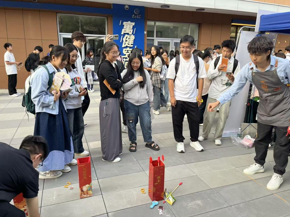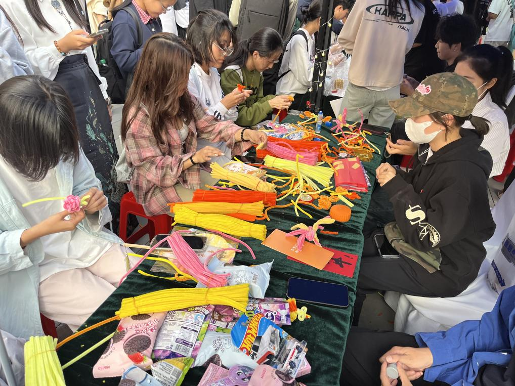 本次活动精心设置了两大趣味环节:古风盎然的“投壶”游戏和创意十足的“扭扭棒趣味编织”。“投壶”活动现场,参与者们凝神静气,巧妙投掷,每一次箭矢入壶都引来阵阵喝彩,将活动气氛一次次推向高潮。活动设置了一等奖、二等奖及三等奖,参与者分别丰富奖品,既增添了活动趣味性与挑战性,也让同学们感受到了传统文化的魅力。“扭扭棒趣味编织”区域则充满了温馨与创意。同学们在志愿者的指导下,发挥奇思妙想,用五彩斑斓的扭扭棒制作出各式各样的眼镜月饼工艺品不仅锻炼了大家的动手能力,更成为同学们交流情感、传递祝福的纽带,一件件独一无二的作品承载着大家对中秋佳节的美好祈愿。