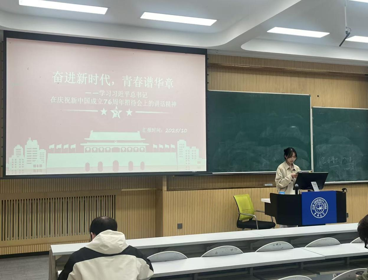学习解读环节,王楠(2023级本科生)向同学们介绍本次团会主题——在庆祝中华人民共和国成立76周年招待会上的讲话。2025年9月30日,习近平总书记在庆祝中华人民共和国成立76周年招待会上发表重要讲话,系统阐述了党和国家在新时代新征程中的历史方位与使命任务,引导青年深刻认识新中国76年来的辉煌历程与重大贡献,强化民族复兴的历史担当。通过回顾76年奋斗历程,为共青团组织开展爱国主义教育与理想信念教育提供了重要理论指引。