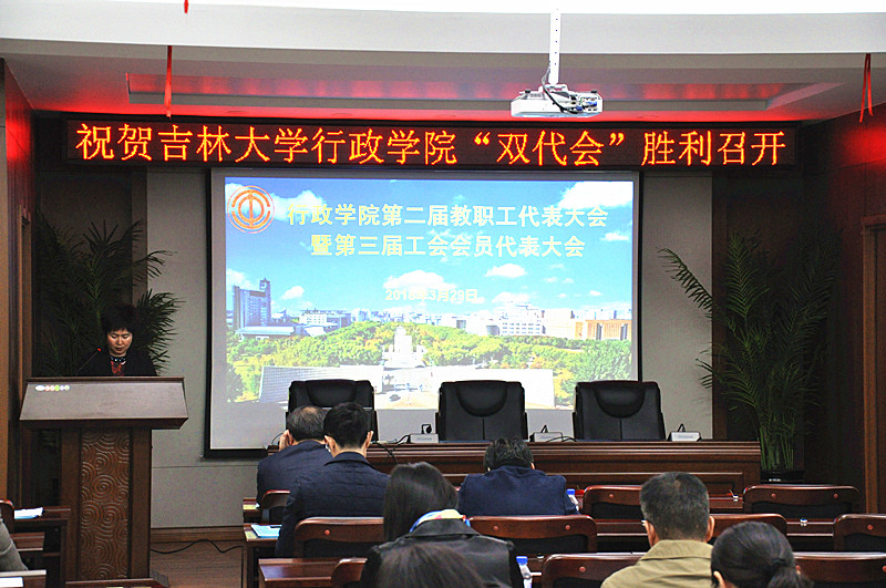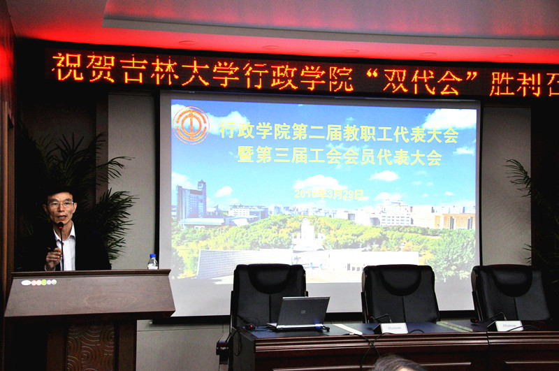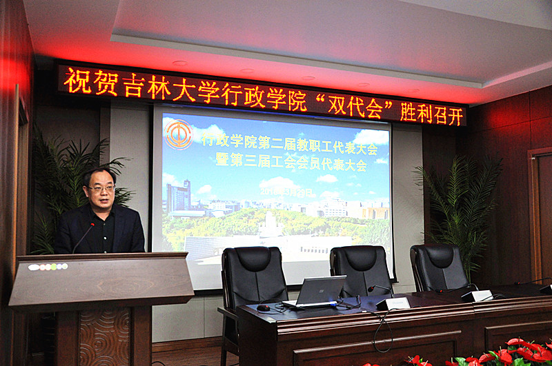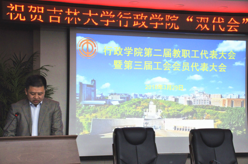 2018年3月29日下午13:00,吉林大学行政学院在东荣大厦B303会议室召开第二届教职工代表大会暨第三届工会会员代表大会。学院领导班子及全体教职工参会,大会由行政学院党委副书记常有余同志主持。