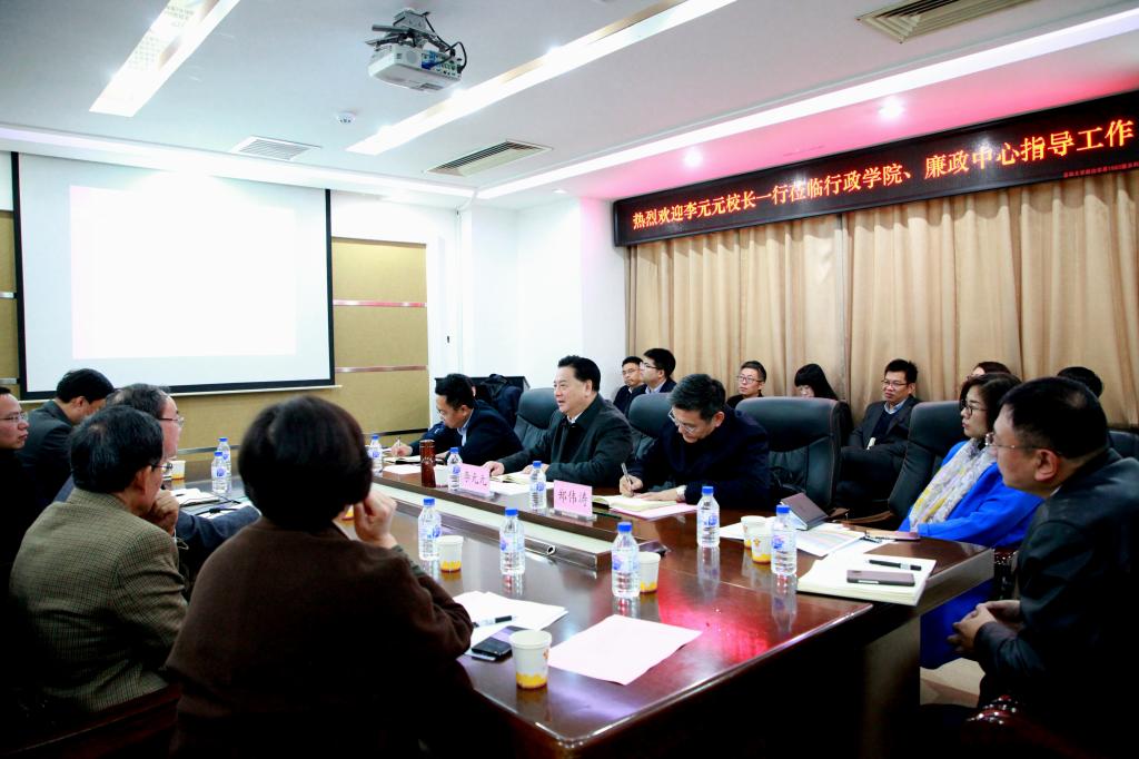 为不断推进学校“双一流”建设,推动优势学科更好发展,加强学校廉政研究与教育中心作用,10月17日上午,校长李元元、副校长郑伟涛与校内相关职能部门负责人一行继3月来院调研后,再次来到行政学院、廉政研究与教育中心,召开座谈会、调研指导工作。行政学院院长张贤明与在校的学院其他领导班子成员,吉林大学社会公正与政府治理研究中心主任周光辉教授,行政学院教学委员会主任李靖教授,吉林大学廉政研究与教育中心有关负责同志及各系主任参加座谈。