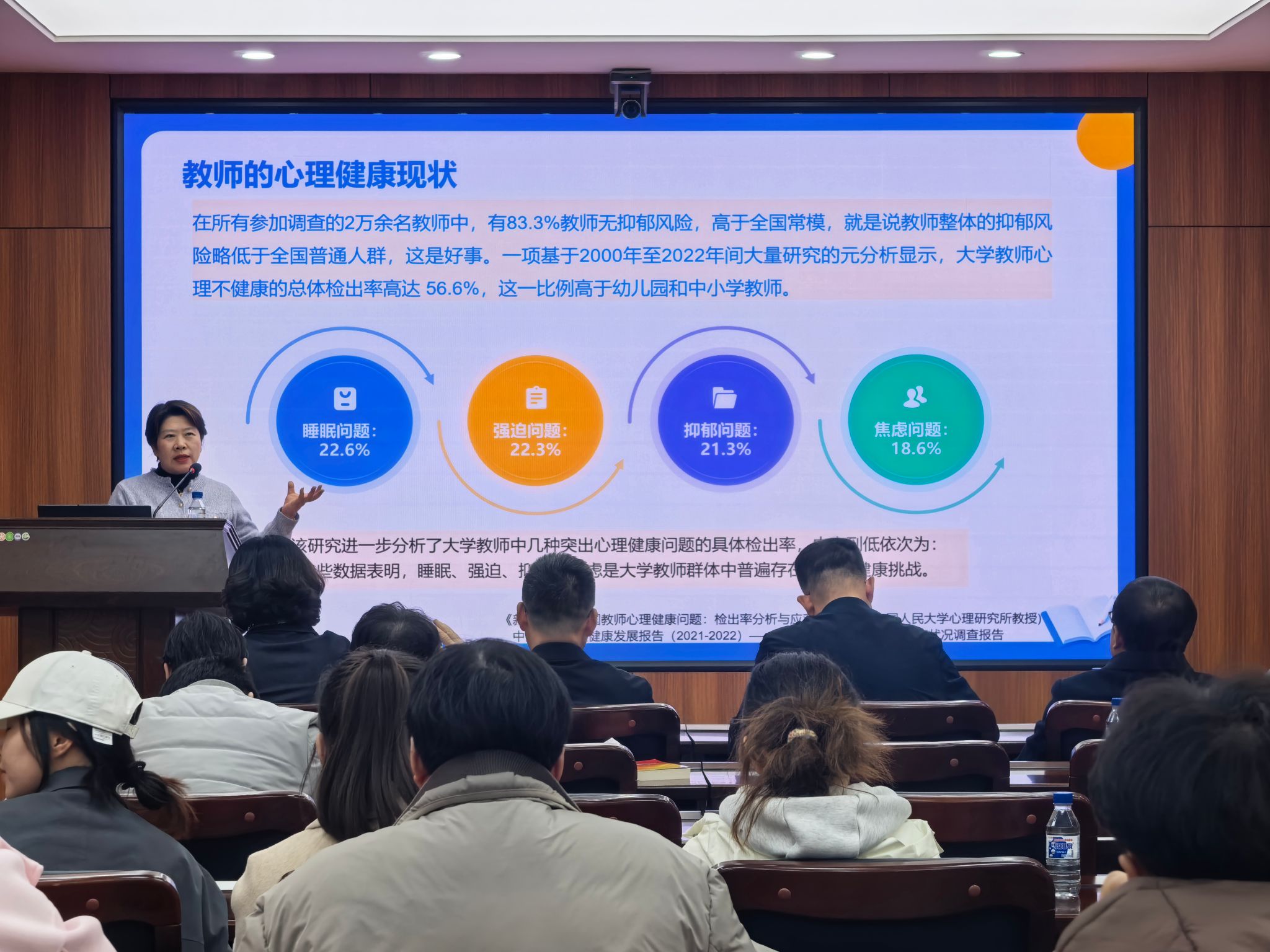 讲座中,何思彤老师围绕教师心理健康状况自评、常见影响心理健康因素识别、自我滋养方法与心理育人技能四个主要内容进行了系统讲解。她结合高校教师工作实际,深入分析了教师在教学、科研、家庭和学生工作中可能面临的心理压力与情绪挑战,并就如何对待压力、处理情绪、增进导学关系、提升调适能力等方面提出了有针对性、可操作性的建议。