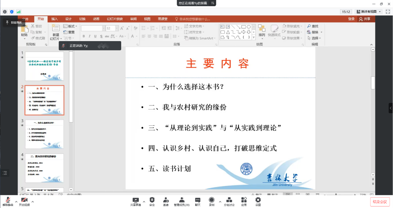 《岳村政治》导论会上,孙德超老师从为什么选择这本书、他与农村研究的缘分、“从理论到实践”与“从实践到理论”、认识自己、认识乡村,打破思维定式四个方面展开首次读书会。首先,孙老师提出“要把论文写在祖国大地上“这一概念,并对其进行解释,然后举例华中学派独具特色的农村研究,孙老师特别强调“农村研究作为中国传统文化研究的根,在研究中国政治时,不能忽视浓醇研究的价值”,而本书正是华中乡土派代表人物于峥嵘老师所著,其中对农村的历史研究及调研记录的全景呈现正是孙老师选择共读本书的独到意义。