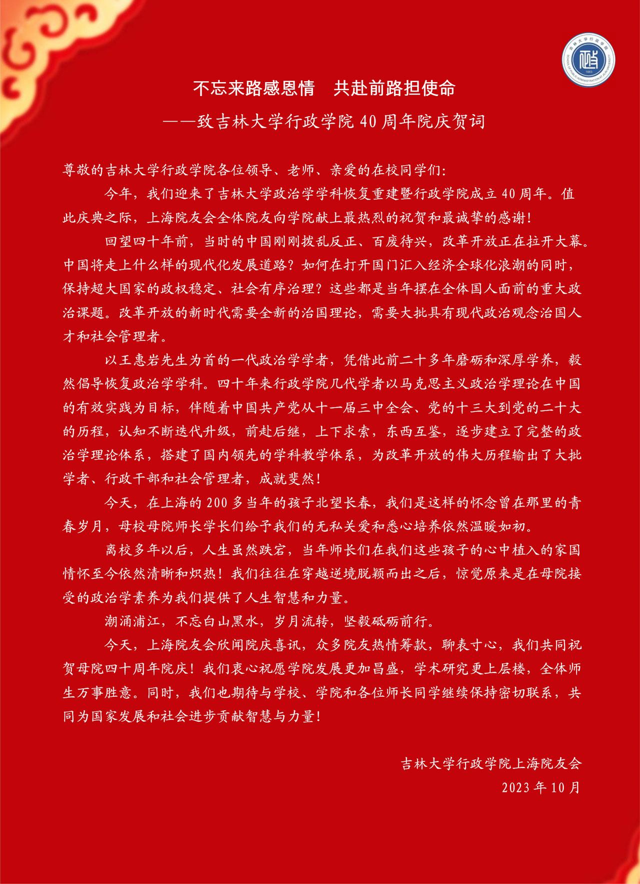 吉林大学上海校友会行政学院分会的贺信